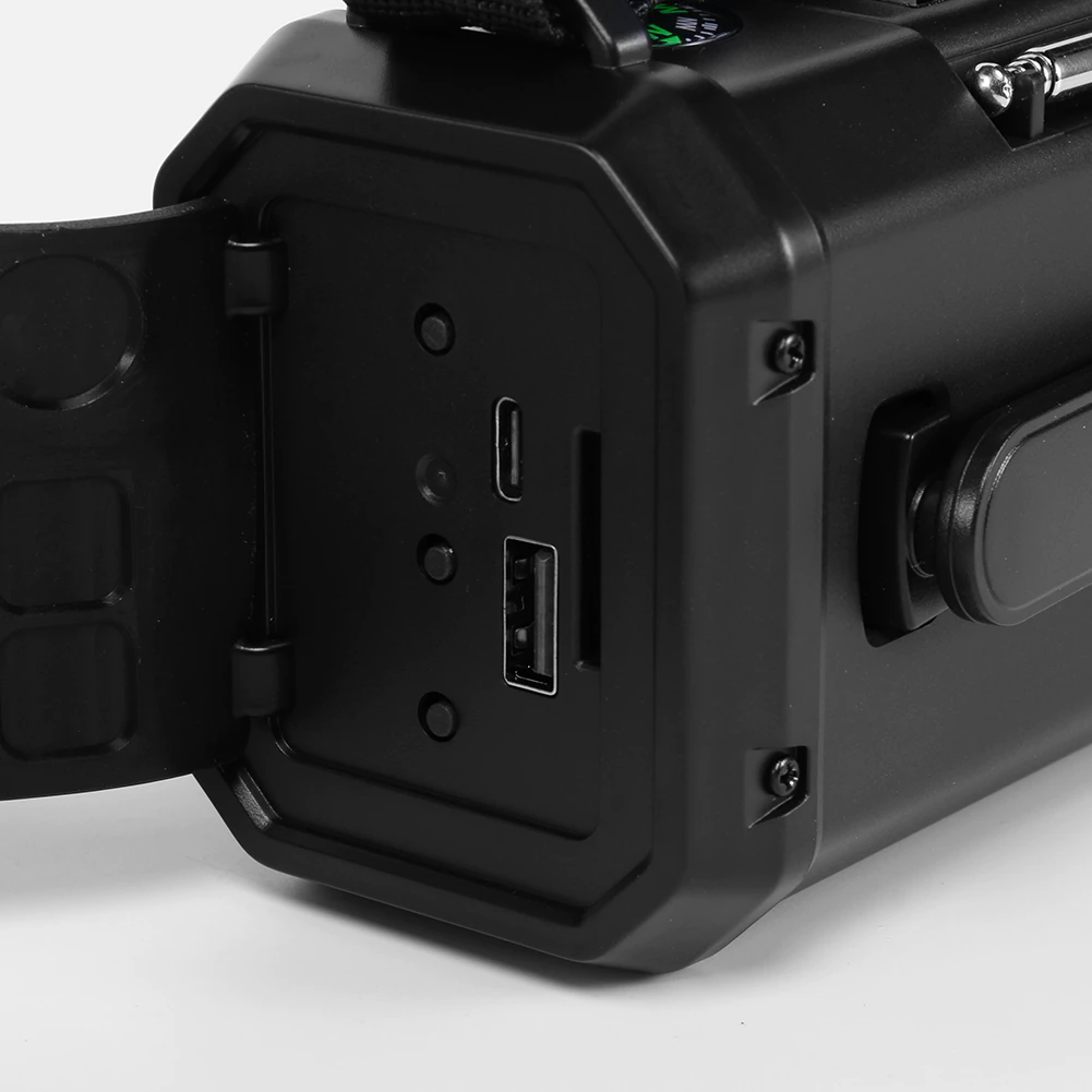 Šis tvirtas avarinis radijas turi įmontuotą powerbank ir gali būti įkraunamas per rankinį generatorių, saulės bateriją arba USB jungtį.