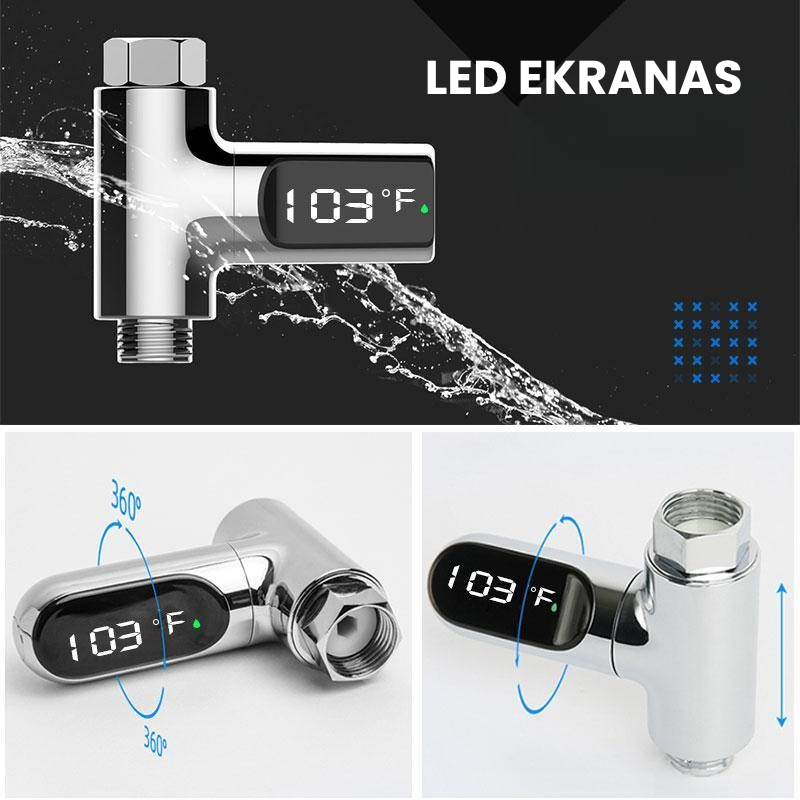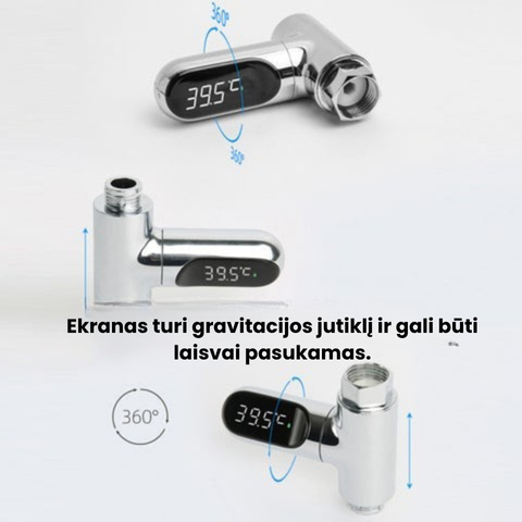 🔄 360° LED ekranas – ekraną galima pasukti bet kuria kryptimi, kad temperatūra būtų matoma iš bet kurio kampo, net esant žemai ar aukštai vandens srovei. Ekranas turi gravitacinį jutiklį, todėl rodmenys visada rodomi tinkamai.