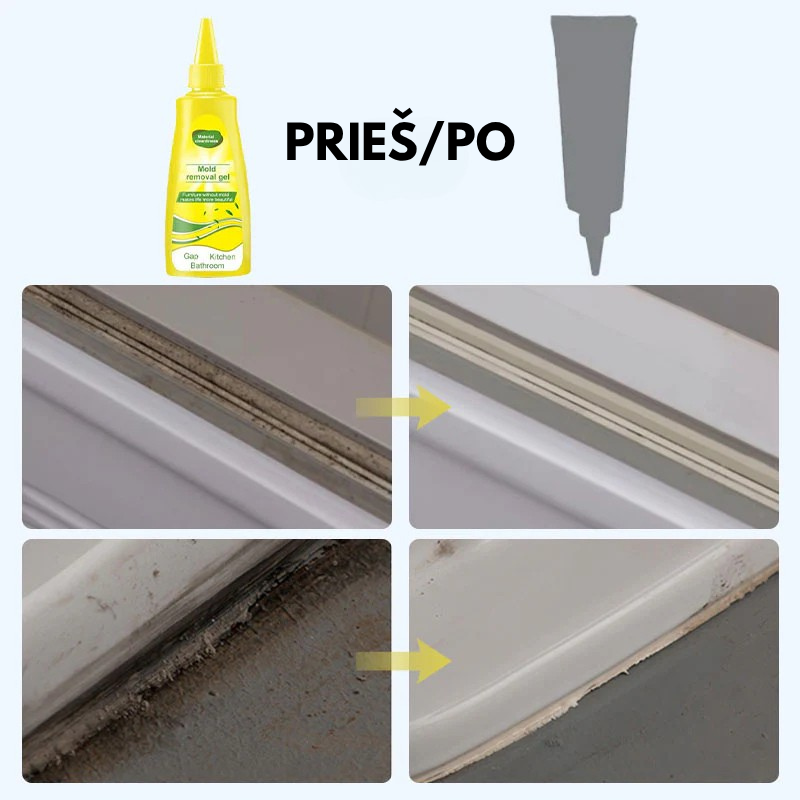 Šis itin veiksmingas gelis pelėsiui šalinti buvo sukurtas tam, kad giliai išvalytų, pašalintų dėmes ir nemalonų kvapą, bei užkirstų kelią pelėsio atsinaujinimui.