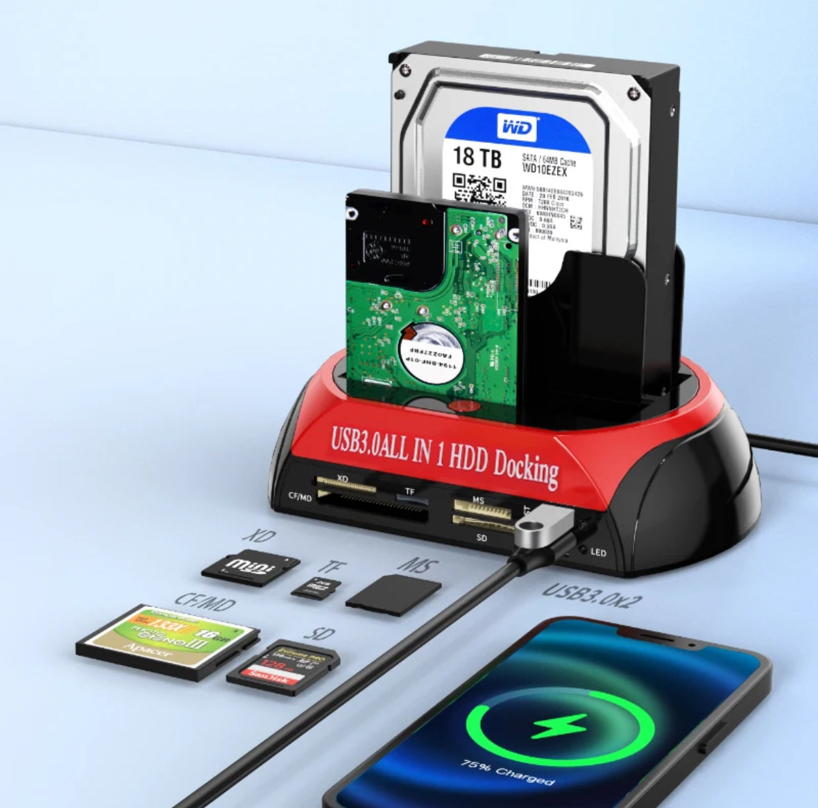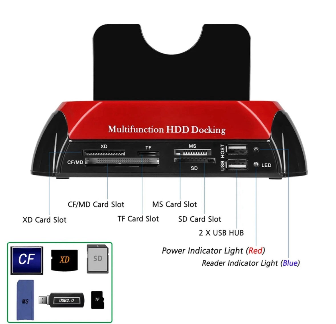 Palaiko visus 2,5"/3,5" IDE/SATA I/II/III kietuosius diskus ir SSD, IDE palaiko iki 2 TB, SATA - iki 8 TB.