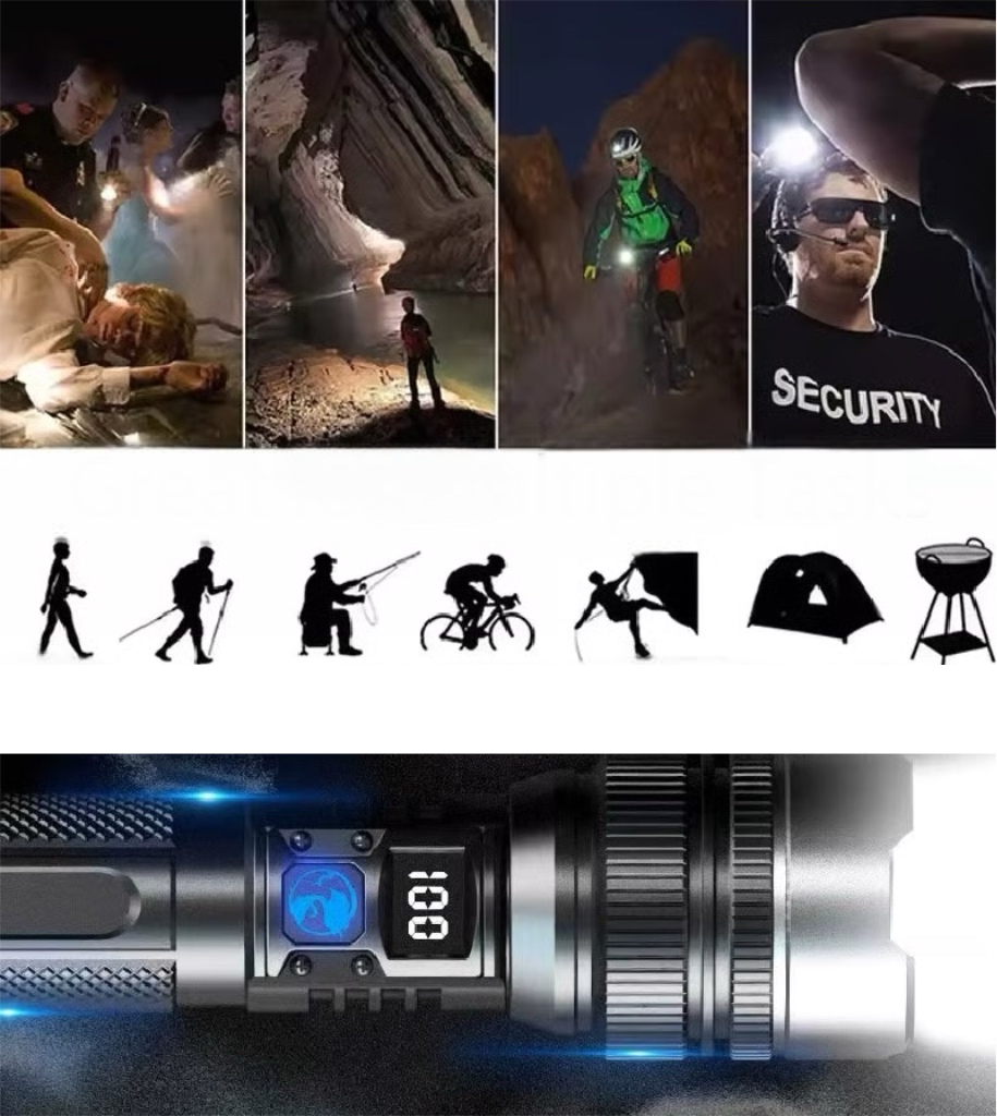⚡UNIVERSALUS POWERBANKAS – Šis žibintuvėlis taip pat veikia kaip atsarginis įkroviklis, leidžiantis įkrauti telefoną ar kitus įrenginius kelionėse.